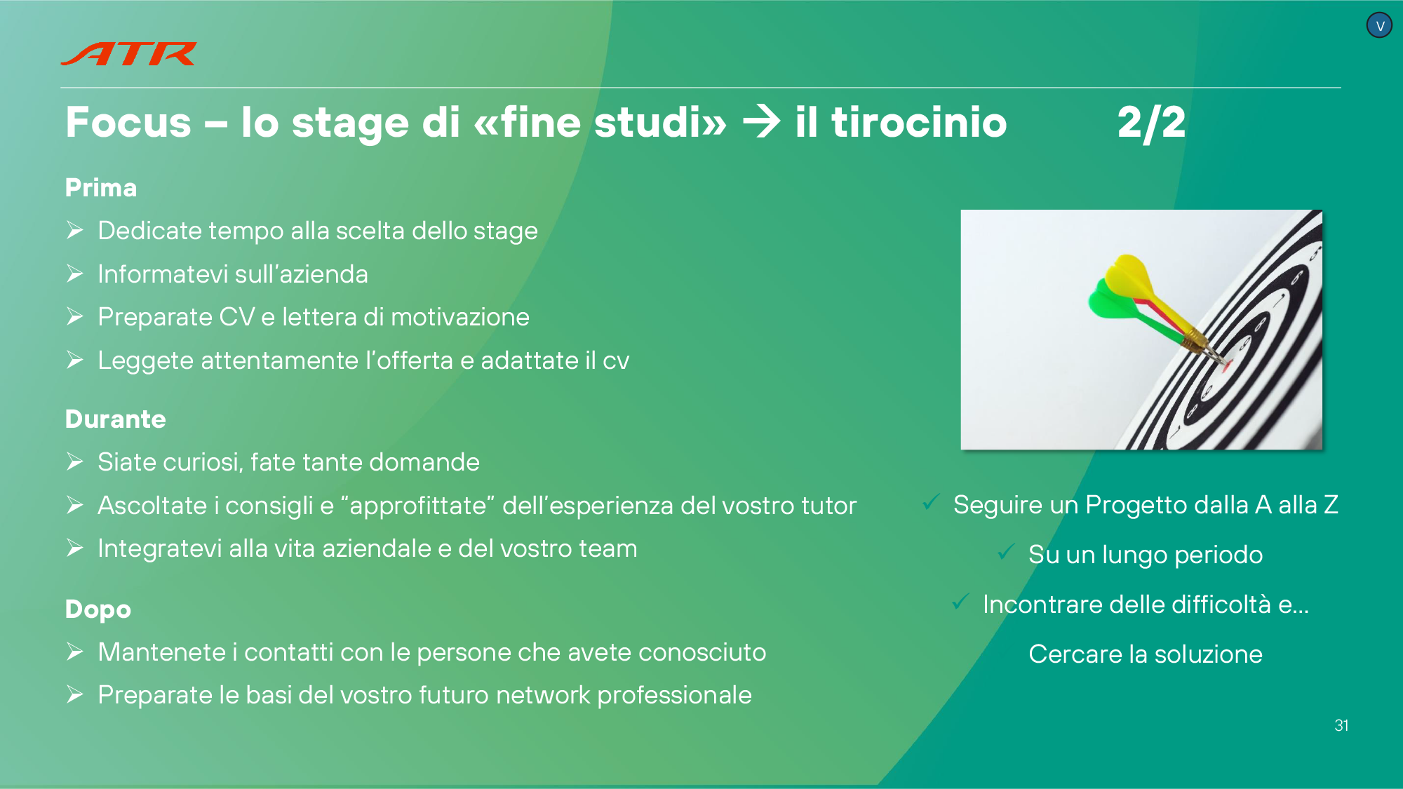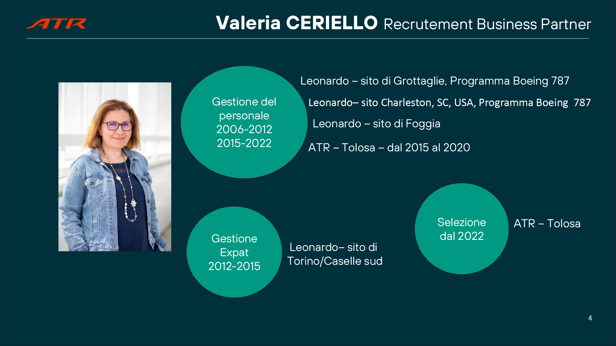 Dal 2015 in ATR. Attualmente si occupa di selezione – in particolare per la Direzione dell’Ingegneria – ed è il focal point per le «politiche giovanili» che includono, tra l’altro, tirocini e stages.