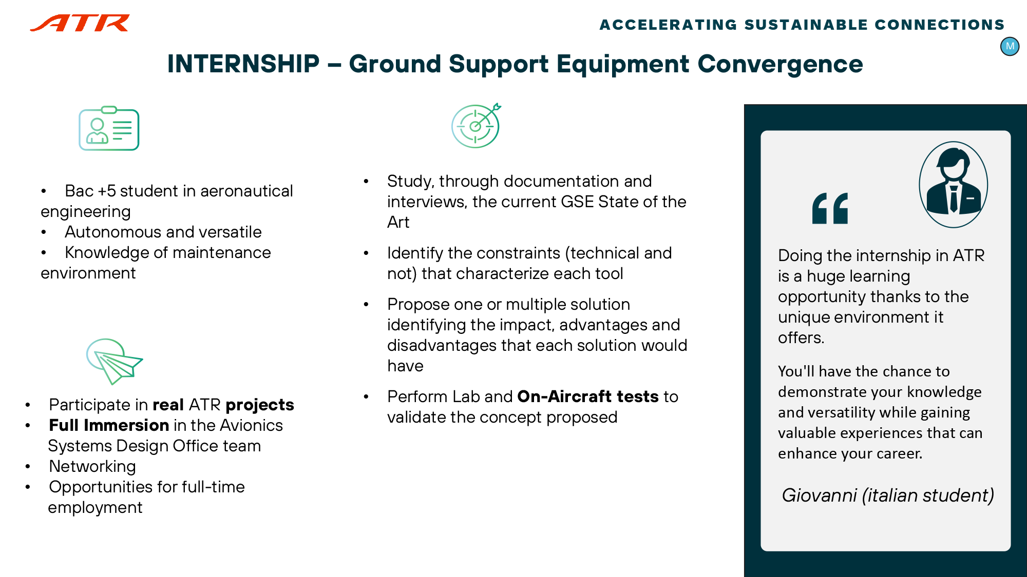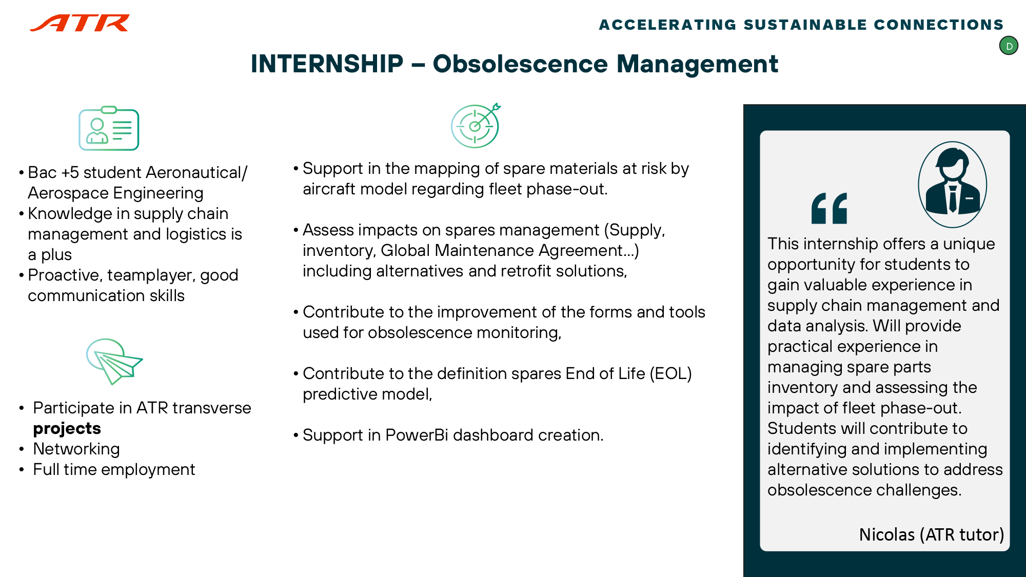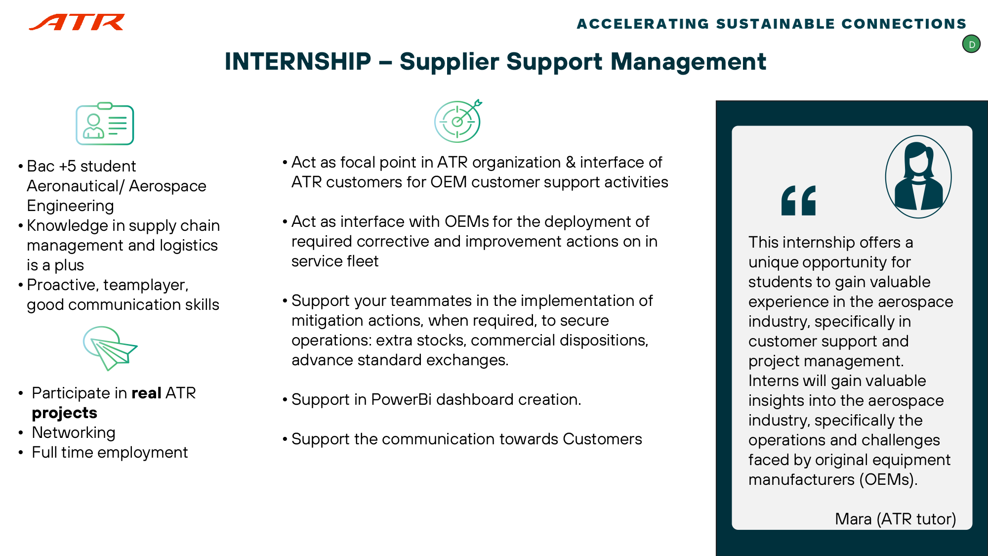 Attualmente è Responsabile del Supporto Clienti in ATR – la sua funzione prevede la supervisione delle attività di supporto tecnico, di affidabilità e prestazioni della flotta, di gestione del supporto fornitori, dell'ingegneria dei pezzi di ricambio e della relazione online con i clienti.