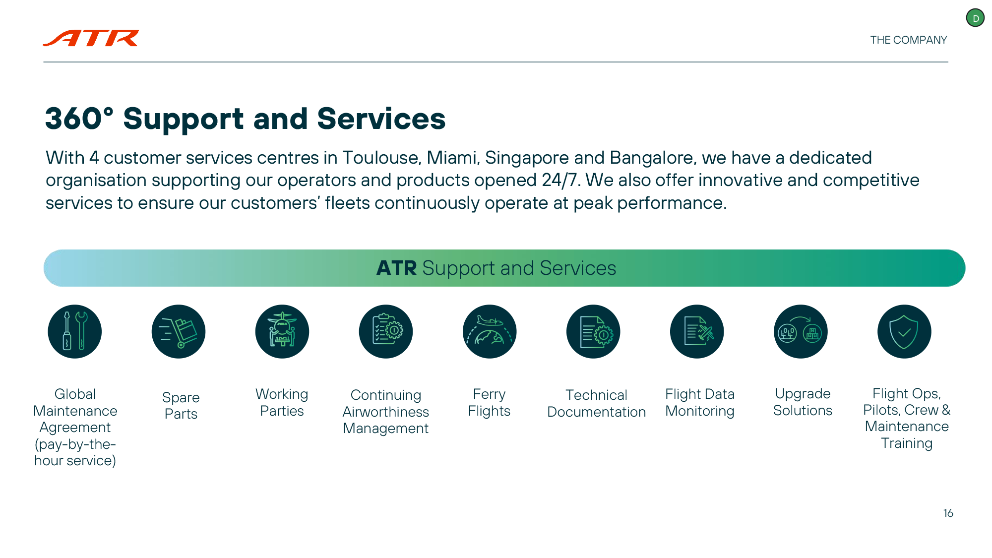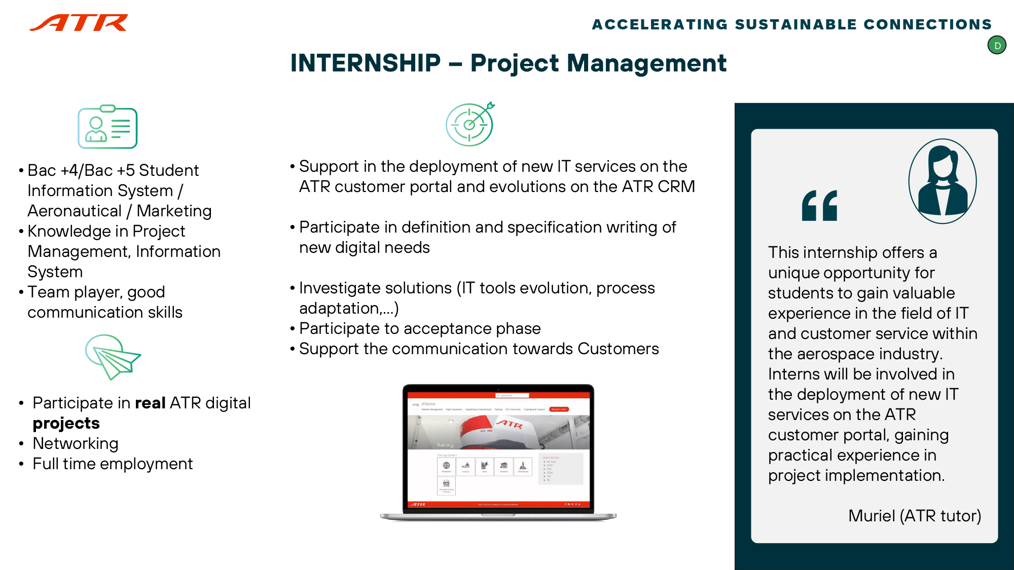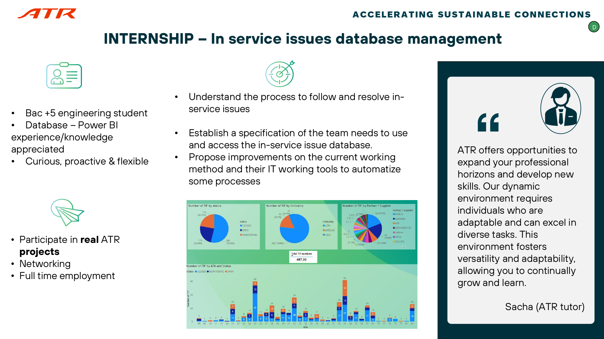 Attualmente è Responsabile del Supporto Clienti in ATR – la sua funzione prevede la supervisione delle attività di supporto tecnico, di affidabilità e prestazioni della flotta, di gestione del supporto fornitori, dell'ingegneria dei pezzi di ricambio e della relazione online con i clienti.