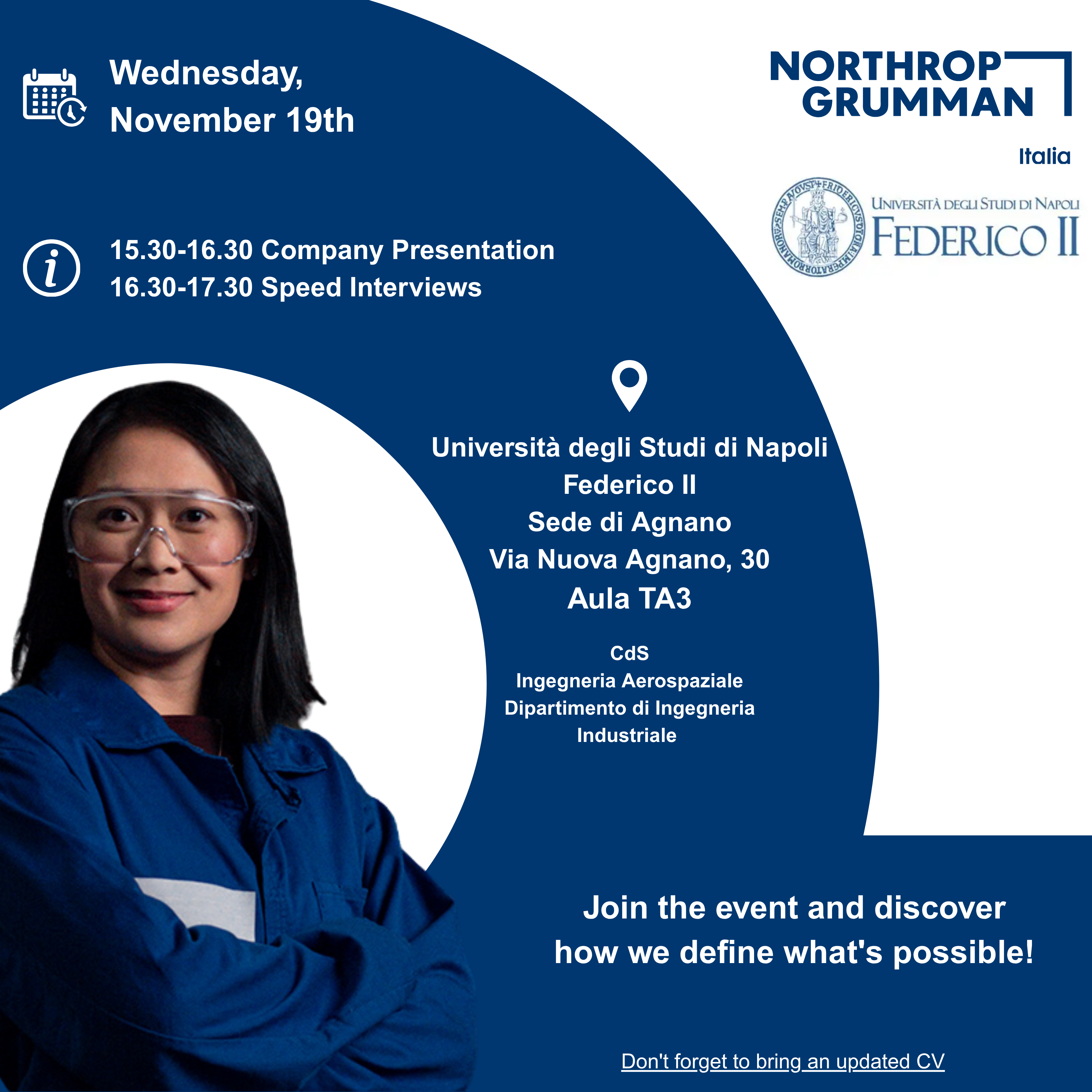 Northrop Grumman Italia offers the option for direct engagement with Federico II students and alumni via a specialised meeting that includes a speed interviews.